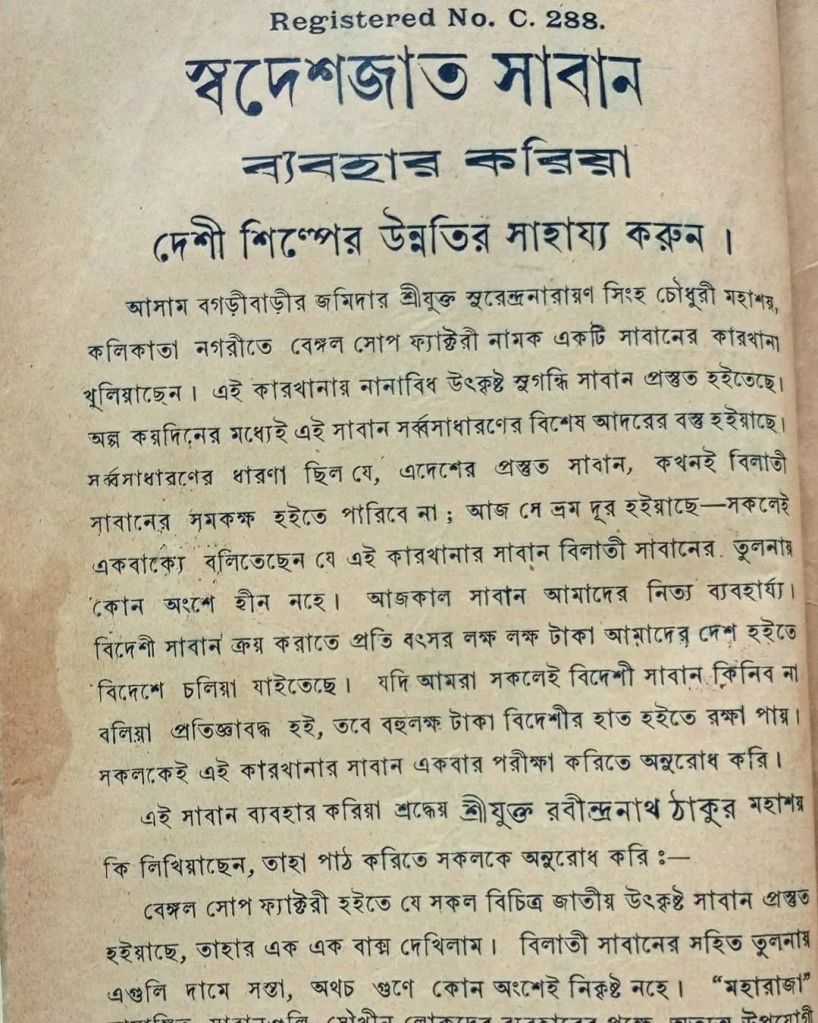 যাই হোক, ১৯০৬ এ “স্বদেশজাত সাবান” এর ব্র্যন্ড এমব্যাসাডার কে ছিলেন জানেন?None other than, আমাদের রবি ঠাকুর! দুঃখের ব্যাপার আজ আর স্বদেশজাত সাবান পাওয়া যায় না। নাহলে এই সাবান মেখেই আমাদের বাঙালিদের কবি হবার আশ মিটে যেত কি?